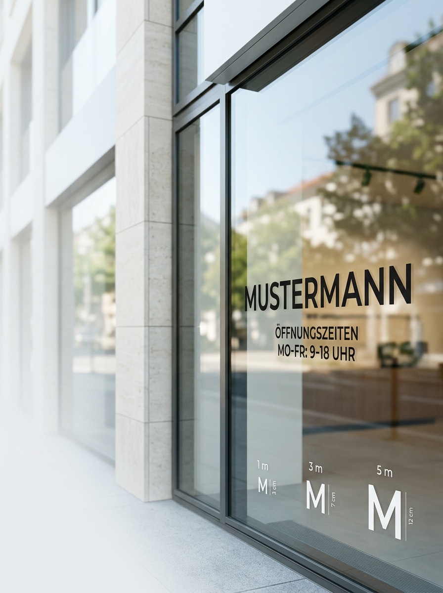 Die Tabelle liefert eine schnelle Orientierung. In der praktischen Gestaltung hilft zusätzlich ein Blick auf die Fläche selbst: Wie viel Platz ist vorhanden, aus welcher Richtung wird gelesen und wie schnell muss die Information erfasst werden? Bei Schaufenstern lohnt sich ergänzend der Blick auf passende Schaufensterbeschriftungen.