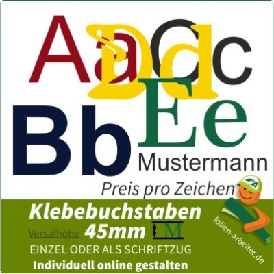 Gestalten Sie Ihre individuelle Klebeschrift online oder bestellen Sie maßgefertigte Schriftaufkleber. Ob Sie 30mm, 50mm oder 100mm benötigen – wir haben die perfekte Lösung für Ihre Beschriftungsaufgabe!