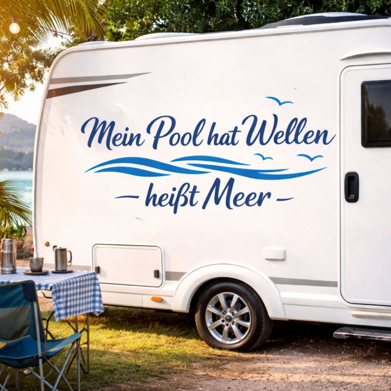 Für alle, die lieber Meeresrauschen als Poolpumpe hören: Dieser Camper-Spruch bringt Urlaubsgefühl direkt auf dein Fahrzeug.Mit Wellen-Optik und Möwen wirkt das Motiv maritim, modern und trotzdem herrlich frech - perfekt für Wohnmobil, Wohnwagen, Van & Camper.